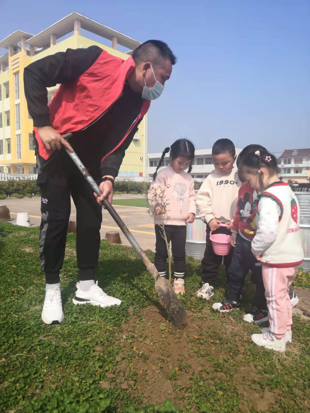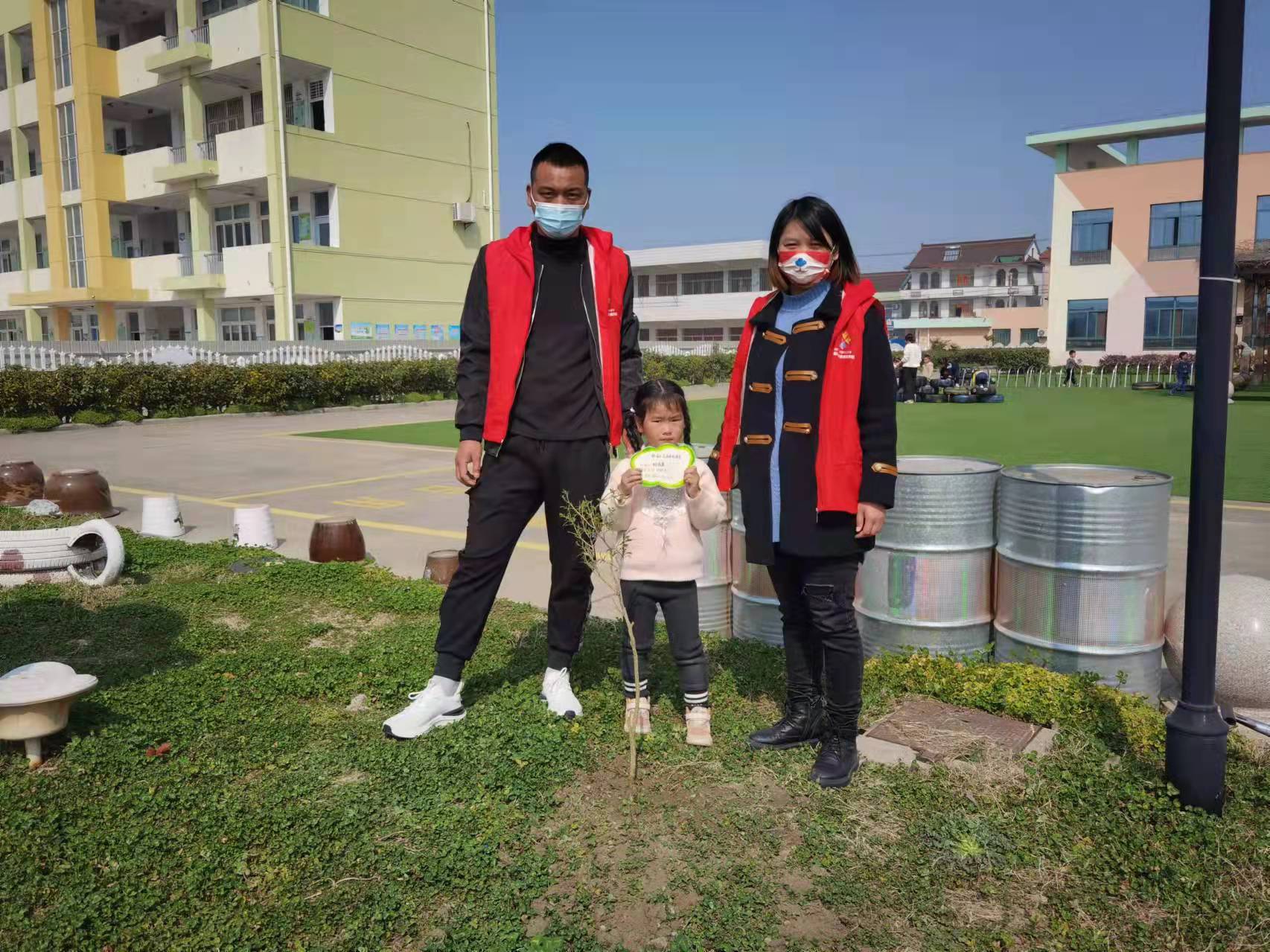 活动中,各年级组为单位,一个个忙碌的身影俨然成为一道风景线。小班组开展亲子“绿植领养”活动,带领幼儿认识树宝宝,与家长志愿者们一同种植一棵果树、一颗风景树作为班级“吉祥物”;中班组幼儿亲手制作爱护环境的心愿卡,带给树朋友一份祝福;大班组在老师的带领下,一起挖坑、扶树苗、填土、浇水……一眨眼的功夫,在辛勤劳动下,树苗便“亭亭玉立”在沃土上,为春天种植希望,也为地球母亲添上了一抹亮丽的绿色。